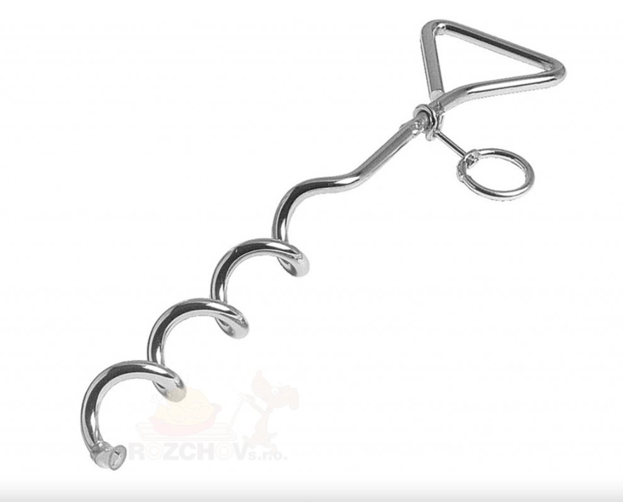 Spirála (připevňovací kolík) z chromované oceli pro připevnění k zemi. Jednoduchý prostředek jak bezpečně a rychle uvázat pejska při výcviku.