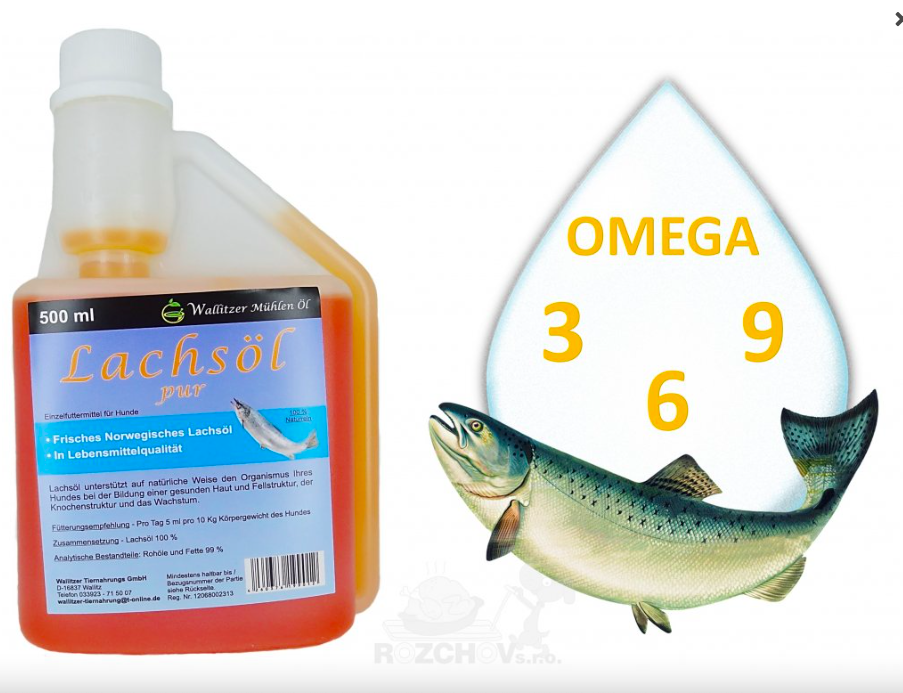 Čistý, přírodní, neředěný lososový olej v potravinářské kvalitě Wallitzer 500ml pro psy. Lososový olej je přirozeně bohatý na omega 3, 6 a 9 mastné kyseliny. Tyto kyseliny napomáhají organismu se správným metabolistickým fungováním. Omega 3 mastné kyseliny také pomáhají při udržení nízké hladiny krevního tlaku a cholesterolu. Omega 6 a 9 mastné kyselinyeliminují zánětlivé reakce a také pomáhají zajistit celkovou odolnost a obranyschopnost organismu.