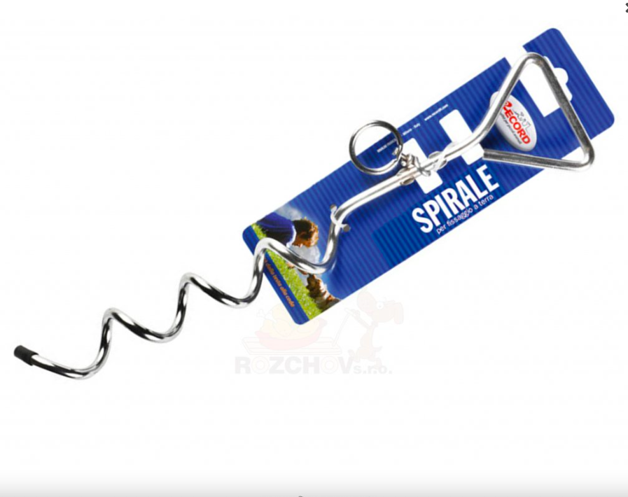 Spirála (připevňovací kolík) z chromované oceli pro připevnění k zemi. Jednoduchý prostředek jak bezpečně a rychle uvázat pejska při výcviku.